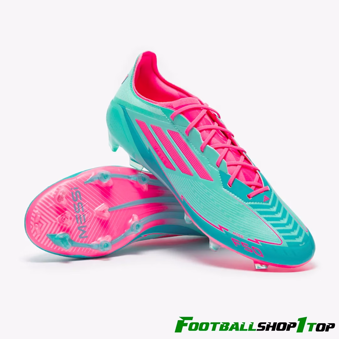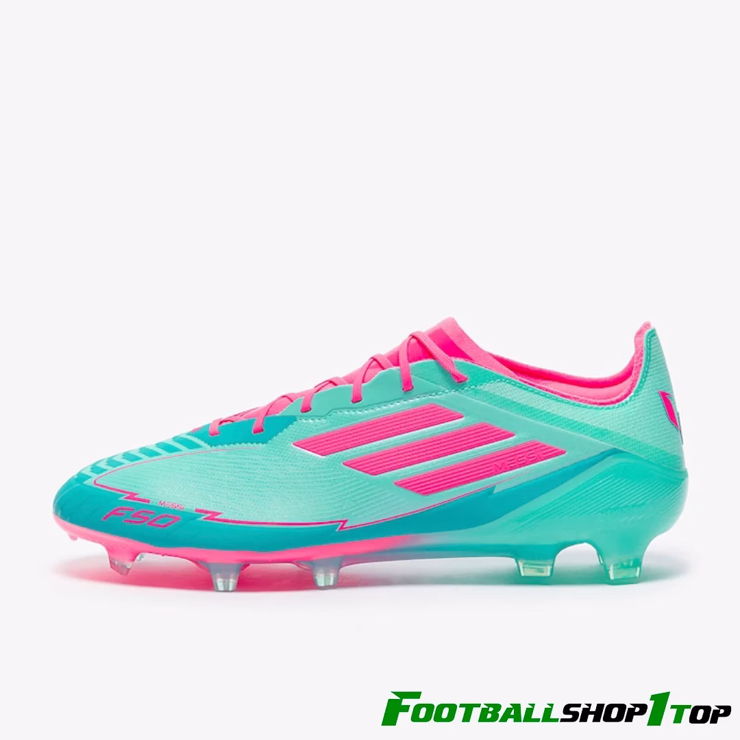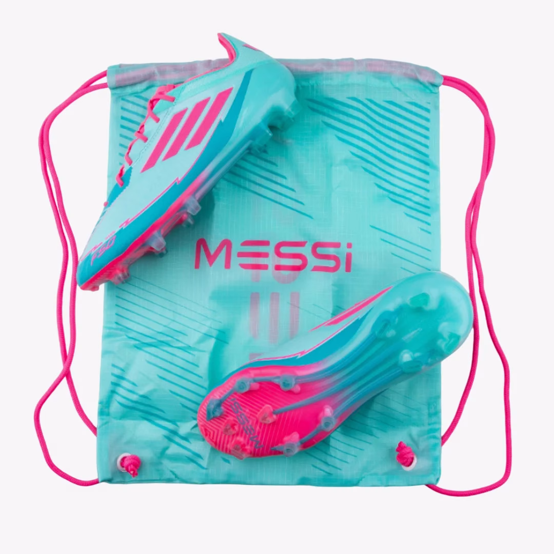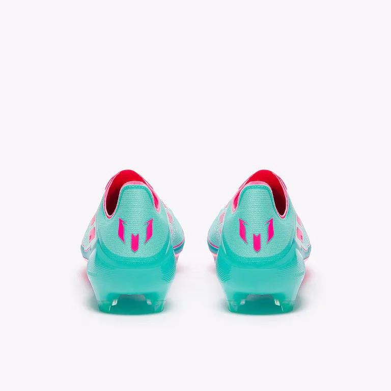 Прагніть до слави, як Лео, у футбольних бутсах adidas F50 Elite x Messi FG кольорів Flash Aqua/Lucid Pink/Lucid Cyan. Розроблені у співпраці з самим GOAT, Messi F50 додають фірмового стилю Мессі до швидкості F50, вирізняючись його улюбленим язичком «буріто» та литими трьома смужками.