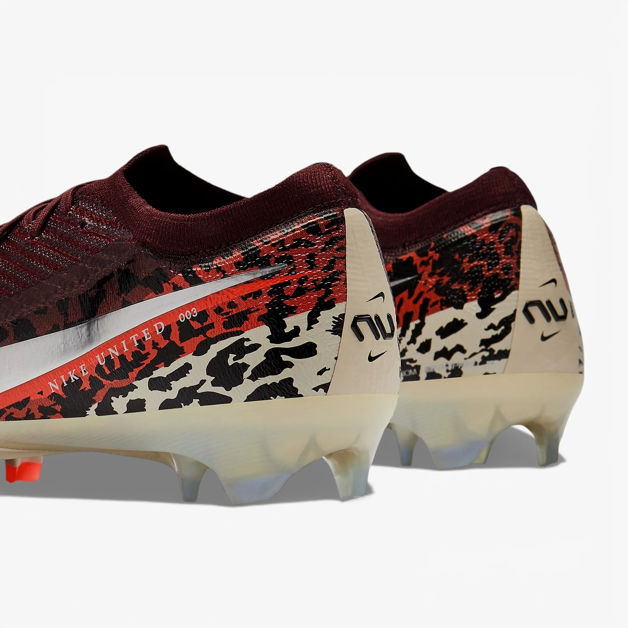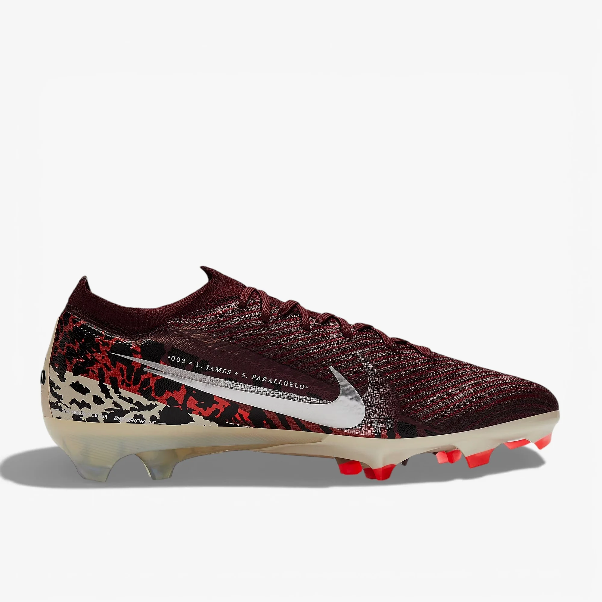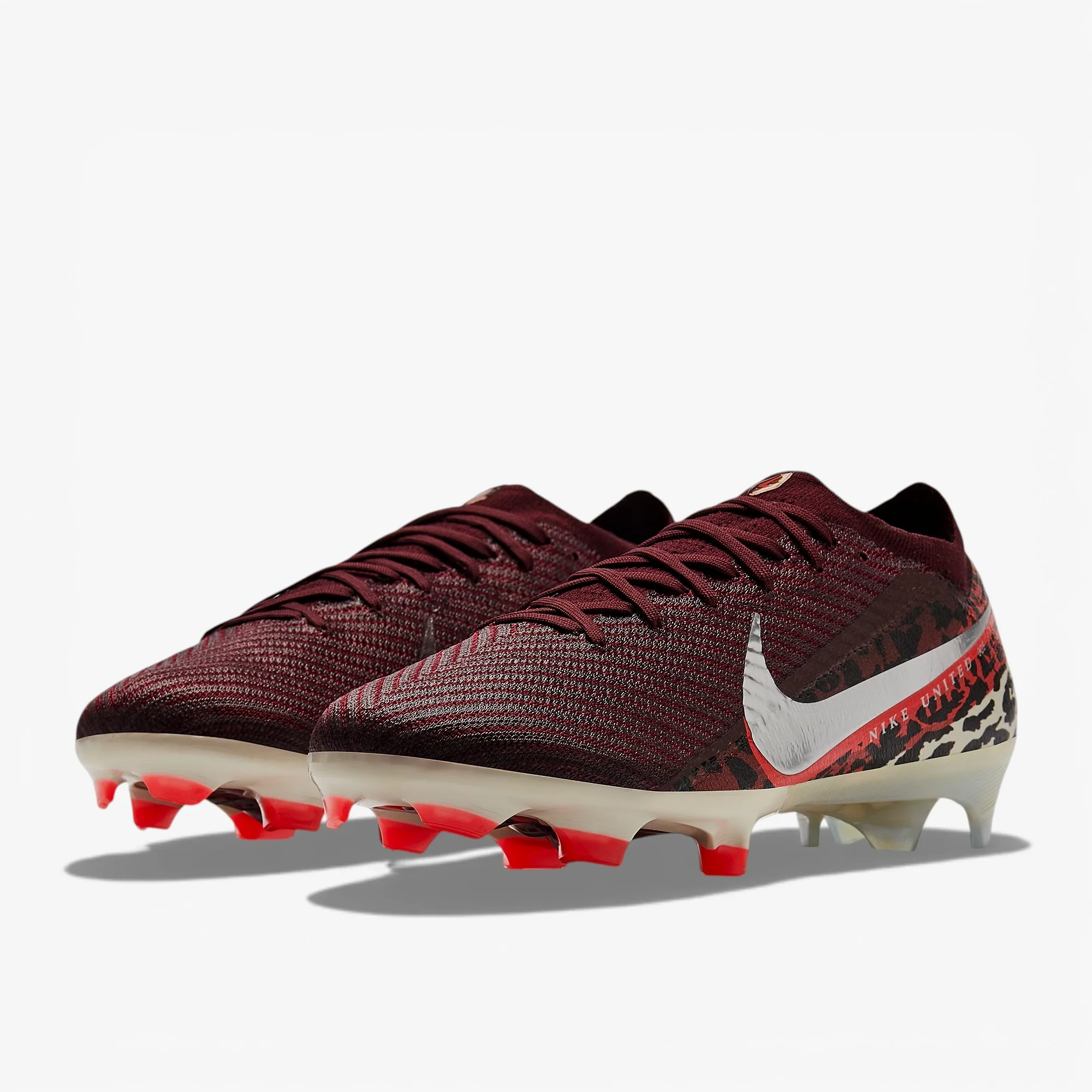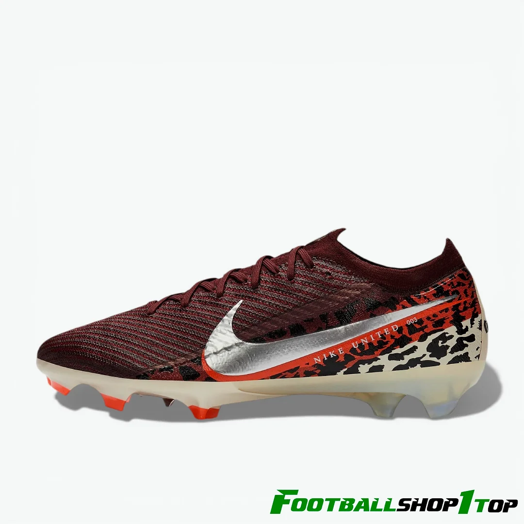 Дика швидкість. Воїнський дух. Грайте за межі можливого у футбольних бутсах Nike Air Zoom Mercurial Vapor 16 Elite FG кольорів Burgundy Crush/Mtlc Silver/Univ Red/Fossil. Частина колекції Nike United Ch.3, яку носять такі зірки, як Лорен Джеймс та Сальма Параллуело, ця кольорова гама з анімалістичним принтом відсилає до інстинктів переможців та змагального характеру найкращих гравців.
