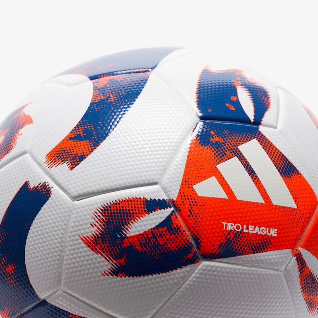 Покажіть свої чисті удари з футбольним м’ячем adidas Tiro League TSBE кольору White/Team Royal Blue/Team Solar Orange, який має безшовну конструкцію TSBE для бездоганного дотику та меншого водопоглинання.
